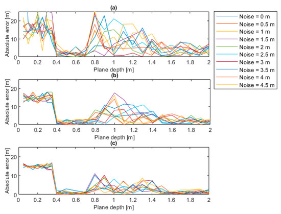 Error trends for different noise levels (a) plane depth of 0.05 m, (b) plane depth of 0.5 m, (c) plane depth of 2 m.