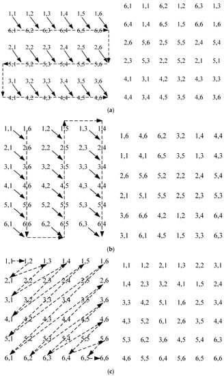 The process of fold transform of a snake line can be described as the following: arrange the pixels in the image matrix in an order of a snake line, put the obtained pixels into 1-D series, and then fold them to the same size as the original image matrix []. Figure 3 and Figure 4c show the detailed process.