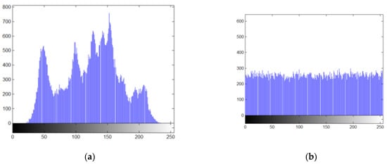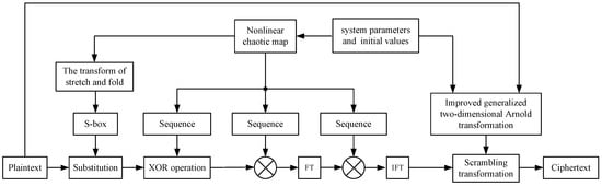 The encryption scheme is presented in Figure 5. We suppose the grey plaintext image P is of size , and the pixel value ranges from 0 to 255. The detailed description is presented as below.