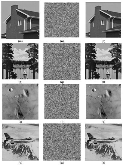 Since chaotic systems have inherent properties of ergodicity, pseudo-randomness, and sensitivity to initial conditions and control parameters, many chaos-based cryptosystems were proposed in the past decade [,,,,]. For example, Li et al. proposed to utilize the Arnold transform to scramble the pixels in the local area of the complex function composed of two original images, and then conducted the gyrator transform operation to encrypt the scrambled image []. Sui et al. developed a double-image encryption algorithm with discrete fractional random transformation and logistic mapping. In the proposed algorithm, the logistic mapping was applied to the diffusion process such that the correlation between adjacent bit planes could be reduced []. Lang et al. designed an asymmetric optical color image encryption algorithm using compressed sensing and quantum logistic mapping. In this algorithm, compressed sensing was explored to reduce data transmission, and quantum chaotic mapping was utilized to generate random phase masks []. Huang et al. designed a nonlinear multi-image encryption algorithm with a chaotic system and two-dimensional (2-D) linear regular transformation. This algorithm could encrypt images in the space domain and frequency domain and compress multiple images into a small amount of data []. Additionally, Abd El Atty et al. developed a novel optical encryption method using the quantum walk and a DRPE system, where the quantum walk was applied for generating the two random masks used in the DRPE system and the permutation and diffusion of an original image as well []. From the above research results, it can be seen that the application of chaotic systems in cryptography is in the ascendant.