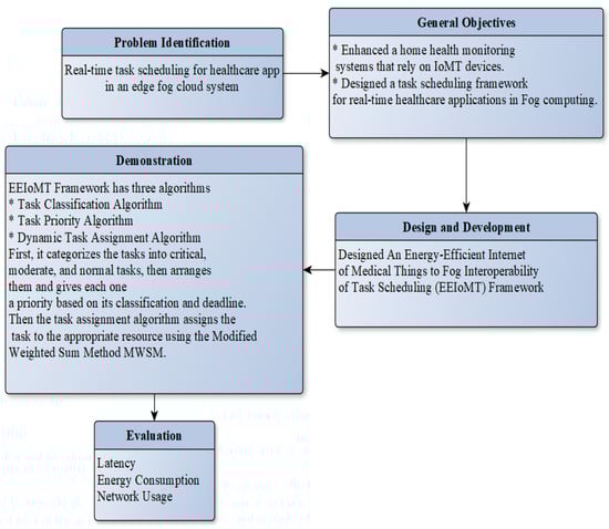 This part presents the methodology of the EEIoMT framework. Figure 1 depicts the research methodology flowchart. In order to develop a solution, we first looked at previous studies to determine the most pressing issue and the elements that influence it. The second step was to determine the goals. The proposed framework’s design and development was the third step. The role of each algorithm in the framework to tackle the problem was identified during the demonstration process. The final step was to analyze the outcomes by evaluating energy consumption, latency, and network usage with the iFogSim2 simulator.