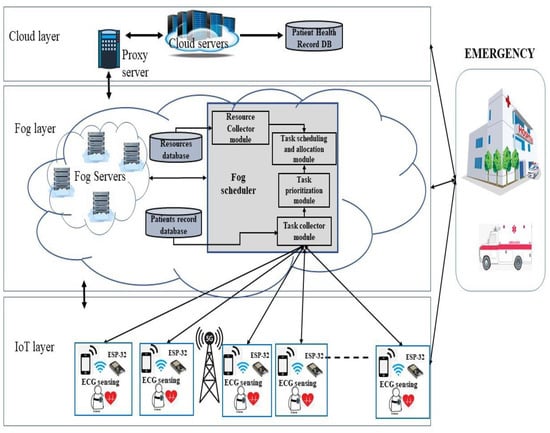 As technology has advanced, applications of the Internet of Things (IoT) have become a part of our everyday lives. As a result, the number of devices employed in these applications will grow, resulting in massive amounts of data being generated. Because the information will be transmitted to the cloud for processing, there will be a delay in response because the cloud is located far away from these devices. Every physical device, such as cameras, automobiles, sensors, wearables, and home appliances, is connected via IoT apps []. One of the core branches of IoT is ubiquitous home healthcare, also known as the Internet of Medical Things (IoMT). Recent developments in IoT and the increasing use of wearables to collect physiological data and vital signals have led to new distributed computing paradigms that combine wearables and IoMT for remote telecare []. Low latency, mobility, location awareness, and a fast reaction time are all requirements for many applications. For different applications of healthcare systems, a straightforward sensor-to-cloud architecture is not feasible, owing to the fact that most clinics and hospitals do not want to retain patient data externally []. Additionally, there is always the possibility of a crucial network or data center failure, putting patients’ lives in jeopardy []. Using the cloud only causes delays while transferring information from IoT devices to the cloud and from the cloud to doctors or hospitals. In the healthcare system, there must be a rapid response to emergency situations, and this requires actions in real time, where time and efficiency play an important role, and this may be harmed as a result of the cloud’s latency []. Thus, classic centralized cloud computing should be expanded to a distributed architecture. The term “distributed architecture” denotes the process of separating duties and subsequently offloading them to several nodes. Despite the fact that many academics have created techniques to increase the performance of cloud computing in real-time applications, IoT applications and mobile services still face several hurdles, including low latency, high reaction speed, cost, energy consumption, mobility support, and geo-distribution []. Thus, it was essential to create new technology that was closer to IoT devices and that could solve the cloud’s difficulties. In 2012, Cisco proposed fog computing [].