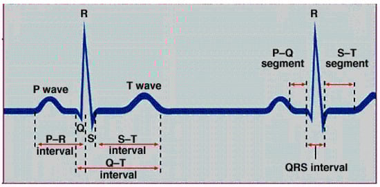 The diagnosis of cardiac problems known as arrhythmias, such as bradycardia, tachycardia, and heart rate variation, is made easier with an ECG feature extraction algorithm. The heart rate and arrhythmias are determined using beat detection, and abnormal beats are detected using additional processing. The acquired ECG signal can be segmented into the P wave, T wave, and QRS complex. Different time intervals, such as PR, QRS, QT, and ST, are obtained, as shown in Figure 3.