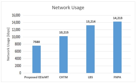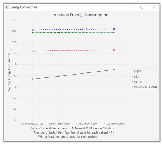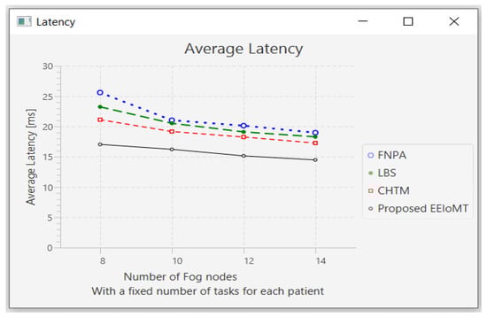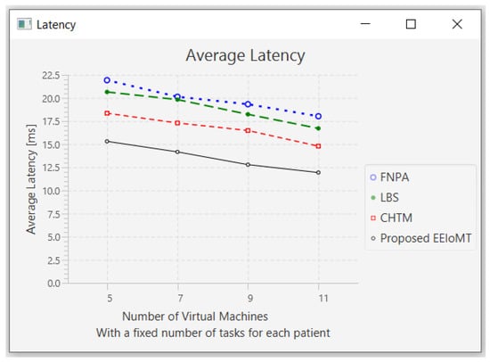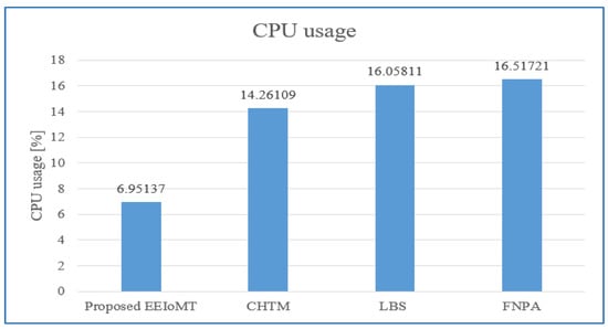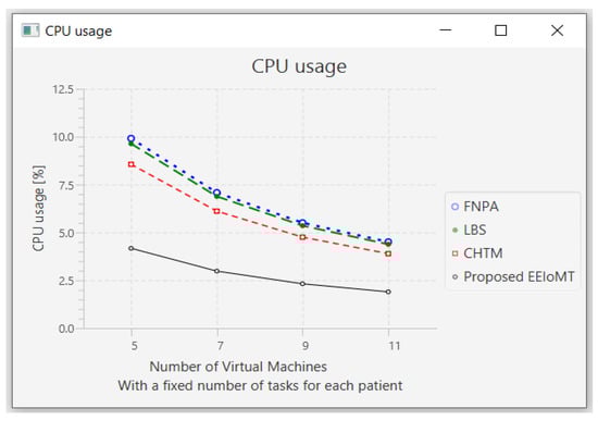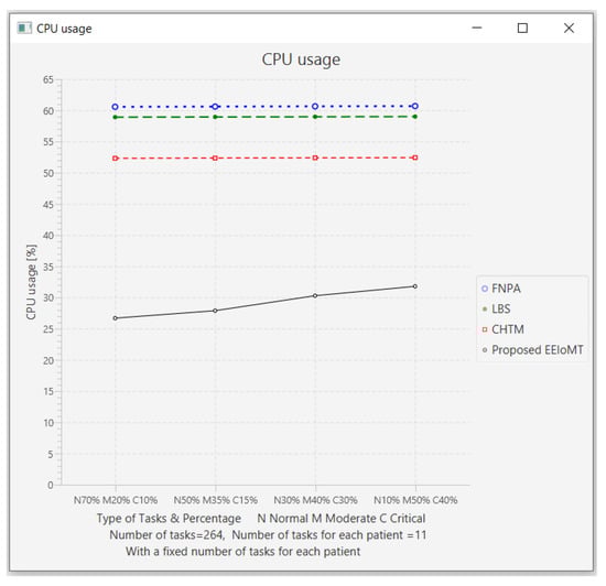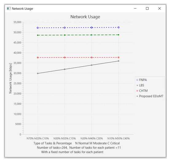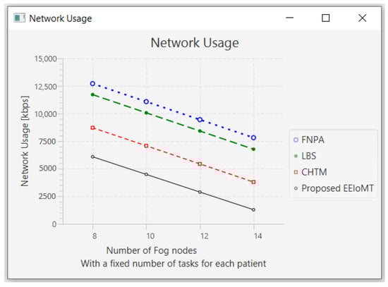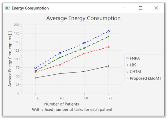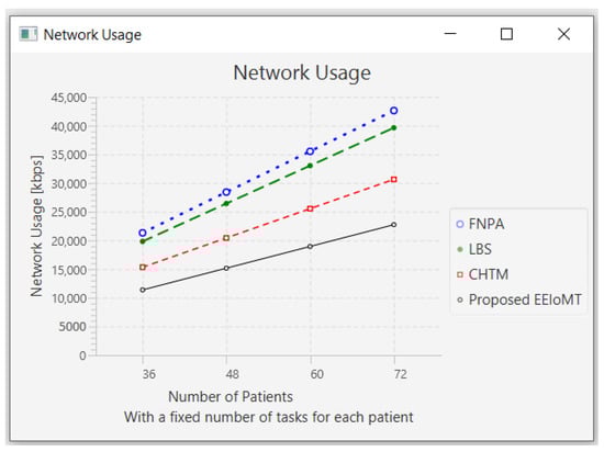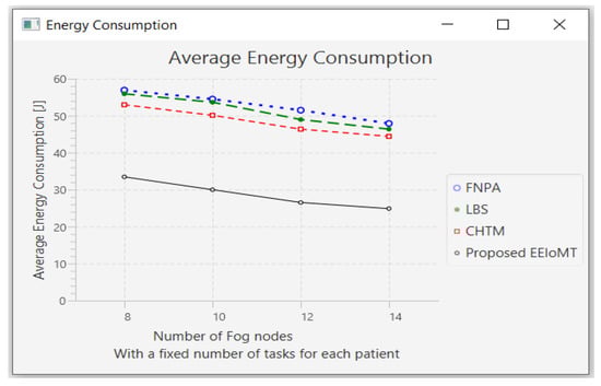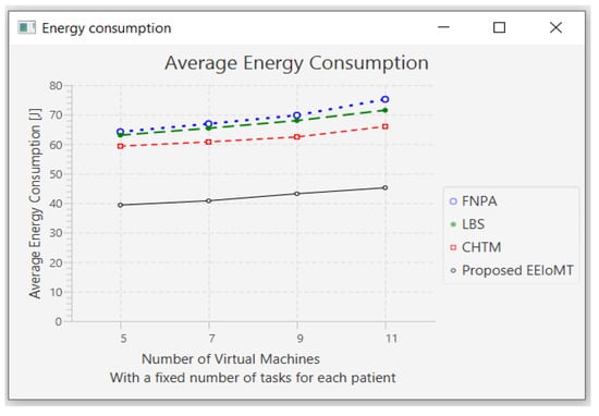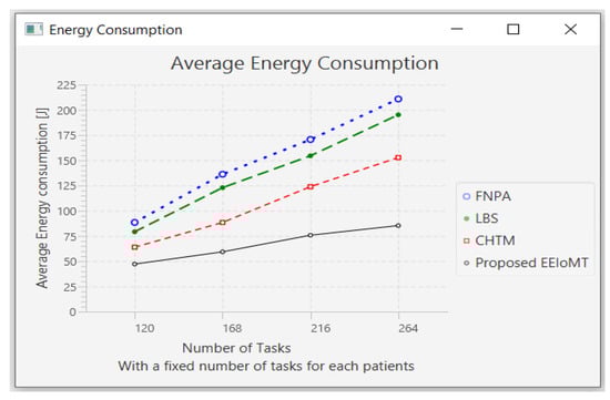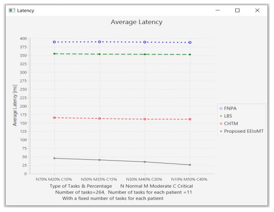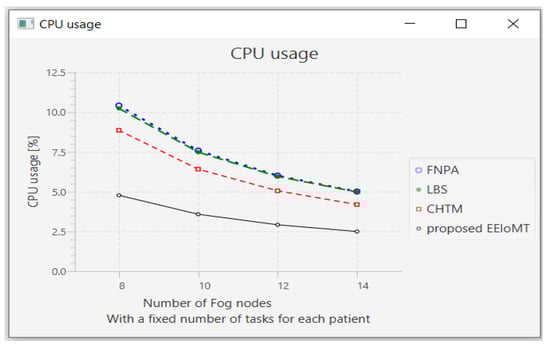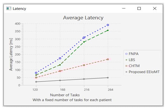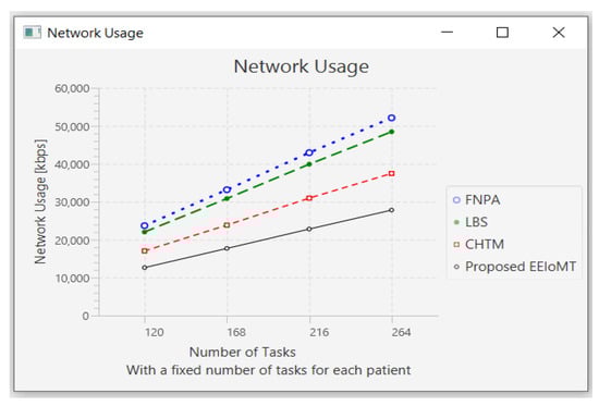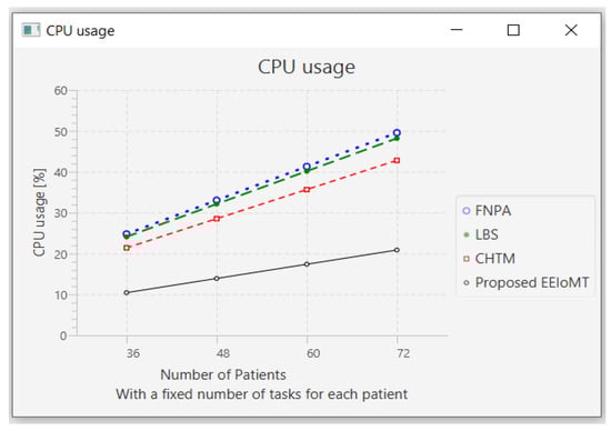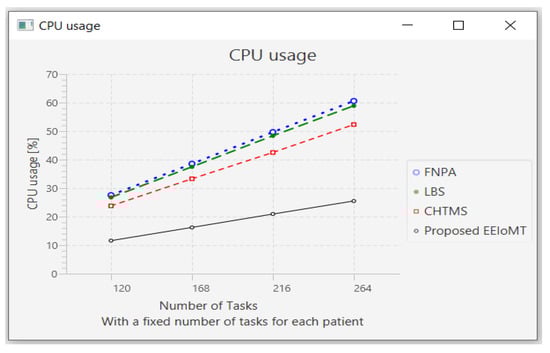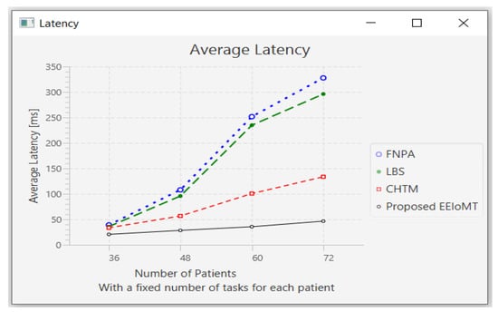 The importance of the location where the task is to be examined in the fog computing architecture was not taken into account by the task scheduling algorithms in most related publications. The incoming tasks from the IoT device were assigned to the nearest accessible fog node in these cases, regardless of the node’s capacity. Further, several of them failed to examine the task’s requirements and importance. In the evaluation of the proposed architectures, several publications never addressed the performance metric of energy consumption. Furthermore, the performance of some proposed architectures and algorithms was assessed by contrasting simulation outcomes with cloud-only architectures but not with fog-based architectures. In contrast to previous research, we ran extensive simulations using four distinct topology configurations and compared the outcomes to the best three fog-based implementations: CHTM, LBS, and FNPA models. The proposed EEIoMT outperformed the CHTM [], LBS [], and FNPA [] models in four parameters: latency, energy consumption, network usage, and CPU usage.