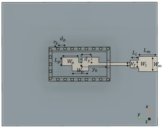 The focus of this first section is on the conversion of the Q-TEM mode of a 50 ML to the mode of a WR-34 (with dimensions × ) located on the same side of the substrate as the ML, so that it can later be used to feed an array of four -spaced H-sectorial horn antennas using an ML. Figure 1 shows the top view of the transition, Figure 2 shows its isometric view and Table 1 shows the dimensions of the transition. The transition is designed using a 0.81 mm thick RO4003 substrate of Er = 3.55 and tan = 0.0027. A full-wave electromagnetic simulation tool, CST Microwave Studio, was used for its optimization. In order to excite the mode from the RW, the excitation of transversal currents in the direction is required. An array of three overlapped transversal patches, as proposed in [21], was used. The length of the patches, the width , the inter-element distance and the array position with respect to the entrance of the RW were jointly optimized to provide maximum bandwidth while maintaining minimum IL. Re-optimization of the transition was carried out when integrating it with the 3D-printed PA shown in the next section. The overlapping of these patches of length is crucial for the excitation of transversal currents. The array is fed by an ML of width and is matched to a 50 circuit with a stepped section of dimensions × . The input to the RW has dimensions × , and ideally these should be as small as possible to avoid leakage from the RW, while also preventing short-circuiting with the ML. The final dimension was chosen considering the manufacturing feasibility.