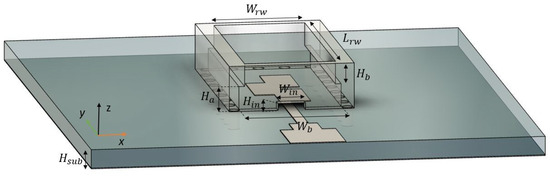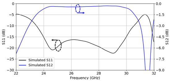 The narrow wall of the RW is stepped (see Figure 2) from dimensions × × to × × , so that the dimensions of the H-sectorial horn antenna along the direction can be reduced for the integration of a mutual coupling reduction (MCR) layer, which is introduced in Section 3. In Figure 3, we show the simulated S-parameters of the ML–RW transition. We can observe a good −10 dB input reflection coefficient ranging from 23.5 GHz to 30.4 GHz. Note that this transition was optimized jointly with the 3D-printed PA above it.