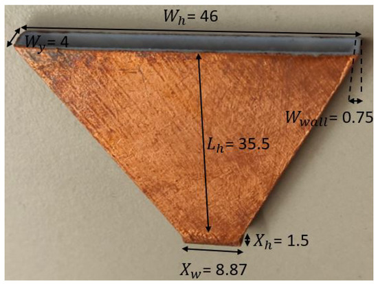 Six H-sectorial horns were designed and 3D-printed, with dimensions as shown in Figure 5. The horns had height , width and thickness . The entrance of the horn had width and height , which was optimized in order to maximize the bandwidth of the joint horn and transition design. The inner side of the horn was empty in order to reduce the transmission losses of the EM fields, and the thickness of the walls of each horn was a constant of value .