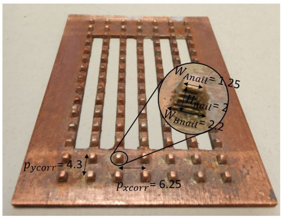 A mutual coupling reduction layer was designed in order to reduce the well-known blind scanning problem [22] of phased arrays. This layer used periodic nails of a trapezoidal shape with a squared bottom shape × , top shape × and height , see Figure 6. The periodic nails, also known as high-impedance surfaces, are a preferred option compared to slits, due to the intrinsic wide-band behaviour.