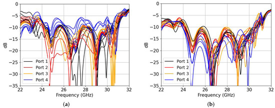 Simulated input reflection coefficients for each port: (a) without nails; (b) with nails. There are 6 traces per port relating to the progressive phase from 0° to 140° at 26.5 GHz.