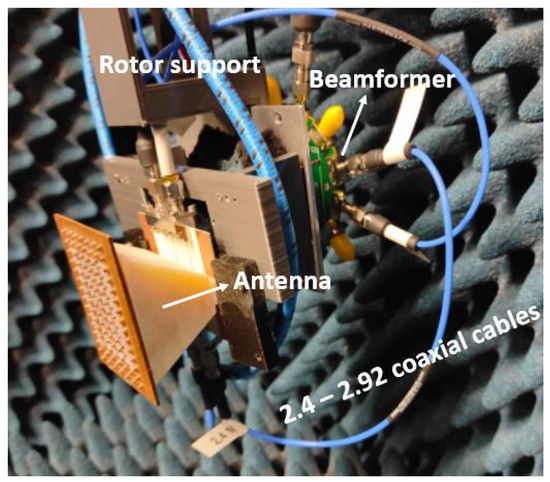 Only the radiation pattern in the E-plane was measured for each scanning angle, using the digital beamformer at four different frequencies ranging only from 26.5 GHz to 29.5 GHz, since the beamformer chip was limited to operating only in the LMDS band. Each channel of the beamformer was calibrated as each cable’s curvature introduced different phases.