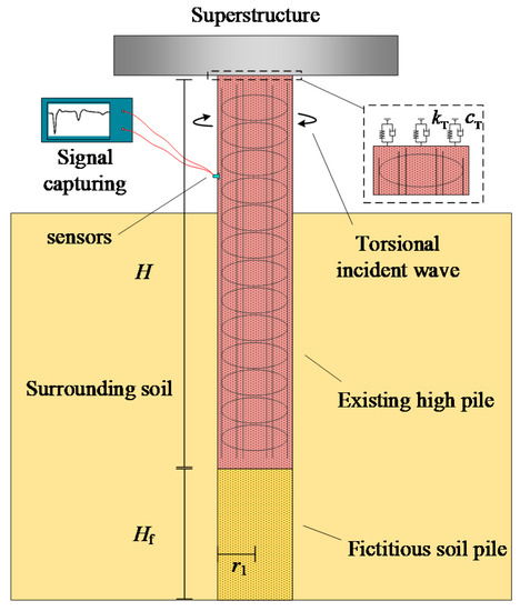 The layout of the TLST for the existing high-pile foundation is depicted in Figure 1. Due to the head of the existing pile being firmly fixed in the superstructure, the torsional incident wave can only be input at the extending pile shaft so that both the upward and downward strain waves are generated. The pile is modeled as a one-dimensional rod in the proposed mathematical model and the surrounding soil is modeled as a three-dimensional viscoelastic medium. The interactions between the pile and the superstructure are simplified to springs and dashpots. Further, the fictitious soil-pile model [28] is introduced herein to authentically simulate the wave reflection at the interface of the pile bottom and the pile end soil. Other general assumptions adopted are listed as follows:
