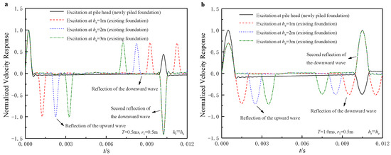 Comparisons of velocity response between existing and newly piled foundations: (a) viscoelastic boundary at the pile end (T = 0.5 ms); (b) fixed boundary at the pile end (T = 1.0 ms).