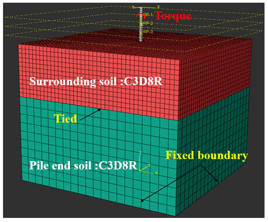 To verify the accuracy of the proposed solution in simulating the simultaneously propagating upward and downward strain waves, the results calculated from the present model are compared with those computed from FEM. The finite element model is established and solved using Abaqus Explicit solver and C3D8R is utilized as the elements for both the soil and pile, the mesh of which is depicted in Figure 3.