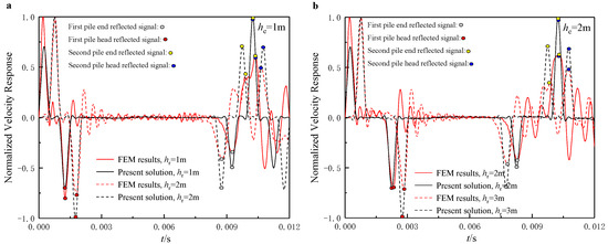 As shown in Figure 4, the results derived from the present solution show good agreement with those calculated from the FEM, especially for the occurrence time of each reflection. However, there can be seen some deviations in the amplitudes of the reflected signal, mainly because of more significant strain wave energy dissipation in the 3D FEM model than in the present solution. In addition, by inputting the incident wave as close to the pile head as possible, the incident wave and the reflection of the upward wave at the pile head are more likely to be identified as one signal so that the difficulties of signal interpretation can be considerably reduced.