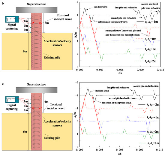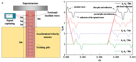 As shown in Figure 5, once the sensors are placed where the incident wave is applied, the number of the reflected signals is minimized, making the signal spectrum clearer. In addition, the time intervals between the incident wave and the reflection of the upward wave collected by the sensors installed above the input position of the incident wave would not vary with the changes in the input position. In contrast, the time intervals collected by the sensors installed below the input position would increase when the input position moves away from the pile head. For cases where inputting the incident wave close to the pile head is difficult, installing the sensors close to the pile head can be an alternative. However, the optimal layouts of the TLST are inputting the incident wave close to the pile head and installing the sensors close to the pile head as well.