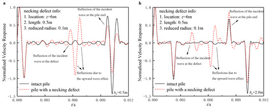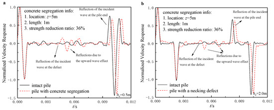 The results shown in Figure 6 and Figure 7 again justified the rationality of the optimal layouts of the TLSTs proposed in the above paragraphs. As shown in Figure 6a and Figure 7a, both the necking and concrete segregation defects can be clearly identified, as long as the incident wave is input close to the pile head and the sensors are installed close to the pile head as well. However, once the incident wave is input far from the pile head, identifying the reflected signals at the defect turns out to be extremely difficult because the reflected signals can no longer be identified as one signal but as several separate signals reflecting all the time, making the signal spectrum a mess. In addition, the concrete segregation defects would alter the pile body’s wave velocity so that each reflected signal’s occurrence time would vary, while the reflected signals caused by necking defects would not.