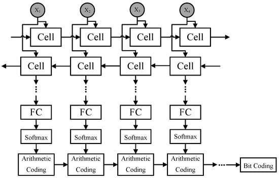 In our proposed algorithm, the Bi-LSTM mode is used, which has significant advantages in time transmission. In the optional model, we analyzed and compared their performance. As shown in Figure 1, the algorithm framework we designed consists of two parts: model training and coding compression. The model includes bidirectional neurons, full connection layer (FC), and softmax layer. The compression part consists of arithmetic coding and bit coding. is displayed at the top of the figure as input. After processing the input with the Bi-LSTM model, the softmax layer calculates and outputs the prediction probability. Then, the prediction probability is compressed into floating-point data by arithmetic coding and finally converted into the binary stream by bit coding. We express the calculation formula of output prediction probability of the softmax layer as:
