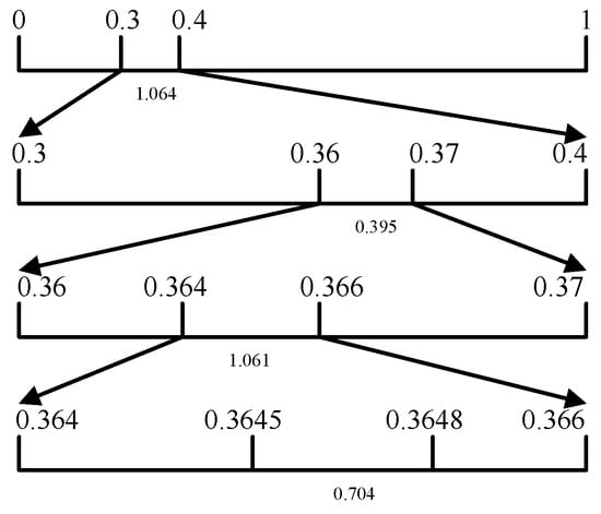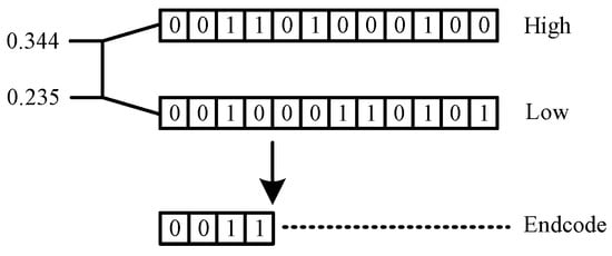 The compression process of arithmetic coding [] in our framework is shown in Figure 2. Arithmetic coding compresses the output of the model, expressing the data in the interval of [0, 1], and the output are converted to floating-point type. This entropy coding is very efficient. The output probability of the model is context-adaptive, the prediction probability is closer to the source probability, the total entropy obtained is smaller, the value range of the final coding interval is wider, and the compression effect will be better than static arithmetic coding.
