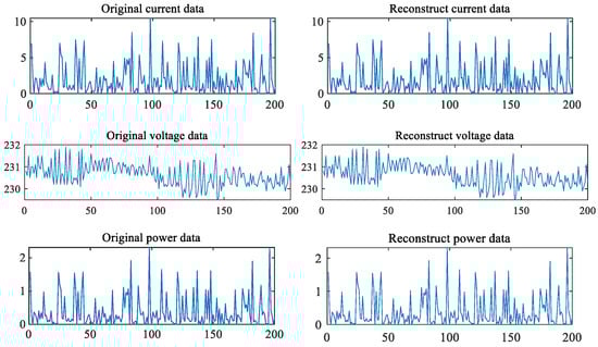 In recent years, some new compression algorithms have been proposed. Gontijo [] compresses power quality data with disturbances through segmentation, transformation, quantization, and entropy coding. He [] combines cross-entropy and singular value decomposition to compress PMU signals. Karthika [] proposed a data compression algorithm for an intelligent power distribution system based on singular value decomposition, which reduces the mean square error (MSE) after compression. Differential binary encoding algorithm (DBEA) [] proposed a differential binary coding method with low computational load and high compression ratio. Sarkar [] expanded the data input range on this basis, but sacrificed compression performance. Then, Sarkar [] analyzed the performance of different types of DBEA algorithms, but DBEA can maximize performance only when there are many repetitive elements, and the effect is very poor in actual phase current and power data. Abuadbba [] and Tripathi [] used Gaussian approximation to improve the traditional encoding method to compress smart meter data. Experiments showed that the compression performance of the improved encoding method is significantly improved. Howeever, the algorithms of the DBEA series are suitable for having a good effect in the case of repeated data, and the effect is not good on uneven data.