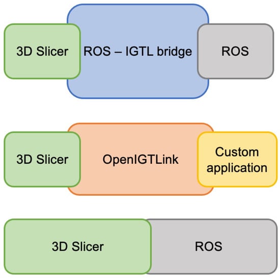 At present, ROS requires custom development to accommodate the imaging, localization, and navigation that is necessary for surgical applications. As well, 3D Slicer does not have a simple interface for robotics. There have been a few approaches taken to bridge the two tools (ROS and 3D Slicer) using a communication protocol called OpenIGTLink []. Namely, the ROS-IGTL bridge [] uses OpenIGTLink to stream data between 3D Slicer and ROS (Figure 1, top). This bridge can be used on any robot with a supported ROS interface but still requires two network hops, customization on the 3D Slicer side, and is limited in the types of messages that can currently be sent. Additionally, custom 3D Slicer and robotics interfaces with OpenIGTLink have been developed—such as the OmniIGT system [] and the LightweightRobotIGT system [] (Figure 1, middle).