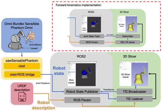 The connections that are relevant to the robot state are highlighted in blue in Figure 3. The module is set up to update the robot state in two ways: either using the built-in ROS transformation package (Tf2) or calculating the forward kinematics (FK) based on the joint values of the robot. The Tf2 implementation is preferred because it supports robots with serial and parallel linkage, whereas the current FK implementation only supports robots with serial links. The latter is included to support a use-case where a user might not want to use the robot state publisher (standard ROS node), which computes the position and orientation of each link for Tf2. For the Omni Bundle robot, the sawSensablePhantom libraries (part of the cisst-SAW libraries developed at Johns Hopkins []) can be used to interface directly with the device and read joint states. The cisst-ROS bridge can then be used to publish these joint states as ROS topics []. Note that this bridge is only necessary for this implementation because, to our knowledge, there is no direct ROS2 interface for the Omni Bundle Robot. Furthermore, this implementation helps emphasize the importance of reducing middleware and bridging wherever possible.