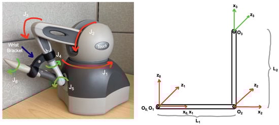 Omni bundle robot used for prototyping the SlicerROS2 module. Previously known as the SensAble Phantom Omni or Geomagic/3DS Touch. Joints labeled in red are actuated, while joints labeled in green are not. (Left) Labeled device. (Right) Device coordinate frames such that L1 and L2 are the link lengths.