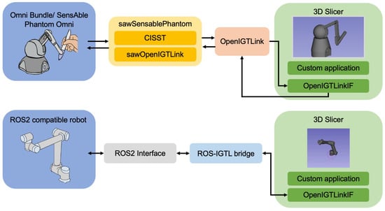 Similarly, the ROS-IGTL bridge has been implemented for message transfer between ROS and OpenIGTLink. Instead of requiring a custom interface to read joint values from the device, the ROS-IGTL bridge is set up to interface directly with ROS-compatible devices. Messages can be sent from ROS to OpenIGTLink with the bridge and vice versa. Figure 5 describes both of these approaches in more detail.