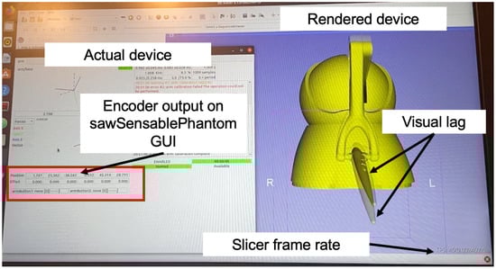 The joint state publisher was updated at a rate of 100 Hz, while the node in 3D Slicer was spun at a rate of 100 Hz and the sawSensablePhantom code published the encoder data at a rate of 100 Hz. The end-effector (EE) of the device was then manually removed from the inkwell (shown in Figure 3—considered “home” for the device), extended, and placed back in the inkwell 15 times. The visual latency was computed by recording the time difference, in milliseconds (ms), between movement completion on the actual device versus the rendered device. The rendering completion time was detected from the recording after the experiment using the open-source, cross-platform video player mpv on Mac (www.github.com/mpv-player/mpv—accessed on 20 June 2022), where playback time can be displayed in ms. To capture, the movement of the actual device, the encoder values of the first three joints were displayed using the sawSensablePhantom GUI, shown in Figure 6. Movement completion for the actual device was considered the time when the encoder readings for the first three joints were stable (i.e., the device is homed), while movement completion for the rendered device was considered the frame/time when the rendered robot was in the expected location and the visual lag of the rendering had stopped. The frame rate of the 3D Slicer viewer was also displayed during the experiment for reference.