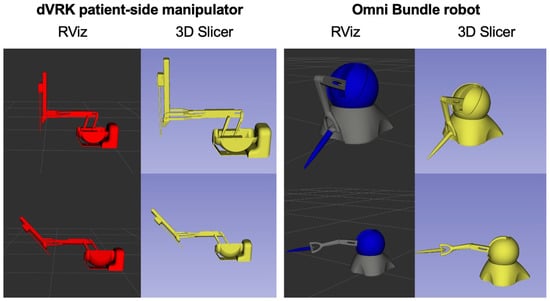 (Left) SlicerROS2 visualization of dVRK PSM1 in two different configurations. (Right) SlicerROS2 visualization of Omni Bundle robot in two different configurations. The viewer on the left is RViz, while the viewer on the right is 3D Slicer for both devices.
