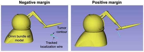 Application of cooperative robotics in previously recorded navigated lumpectomy surgery. (Left) Negative margin—when the robot/cooperatively guided tool is outside of the tumor. (Right) Positive margin—when the robot/cooperatively guided tool is inside of the tumor. Note that breast tumors are generally small [].