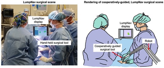 (Left) Surgical scene from LumpNav case with no cooperative robotic guidance. (Right) Rendering of the surgical scene with LumpNav and cooperative robotic guidance.