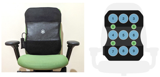 The LifeChair uses specially developed e-textile pressure sensors for tracking the user’s back pressure data [45]. The LifeChair sensors provide force-sensitive output and generate pressure data in the range of 5 g to 10 kg. The 9 sensors are designed to cover the shoulder and lumbar region to account for full-back posture tracking (Figure 2). To capture a wide range of data from users with varying body types and sizes, the size of the sensors is based on the 5th percentile human adult U.S. female (lower limit) and 95th percentile human adult U.S. male (upper limit) seated shoulder width, height, and hip width. The LifeChair cushion model used in this work weighs less than 500 g and measures 52 cm (h) × 40 cm (w) × 2.2 cm (t). The weight and dimensions of the LifeChair cushion make it a portable and flexible solution for posture monitoring in the workplace and at home. The cushion is strapped to a standard office chair through either a single strap or a double strap, depending on the type and shape of the back of the office chair. The LifeChair cushion is also wireless and battery-powered with a 3.7 V lithium-ion battery that provides one to two weeks’ operation time on a single charge. The LifeChair system records in real-time the raw pressure sensor values at a frequency of 5 Hz in addition to the timestamp, posture labels, and user-input data, which include body characteristics (height and weight) and back-pain history data.