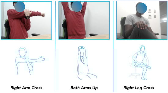 For labeling the stretch pose data, the nature of the stretch pose must be taken into account. Unlike sitting posture, which is a dynamic event, a stretch pose is a static event that requires a conscious and dedicated effort from the user. Subjectivity in stretch interpretation and variable physical predisposition to perform the stretches result in greater inter-individual variability compared to the sitting posture recognition task. A stretch template approach using a similar threshold-based method to the posture recognition task in this case is not desirable. The stretch pose labels were thus obtained manually with video cross-validation and were: both arms up (BAU), hanging arms down (HAD), left arm cross (LAC), right arm cross (RAC), left leg up and across (LLU), and right leg up and across (RLU). This lends further insight into the performance of the machine learning classifiers when trained on data labeled using the posture model described above or with manually labeled data. Figure 5 shows three examples of the stretches performed by the participants, the right arm cross stretch, the both arms up stretch, and the right leg cross stretch.