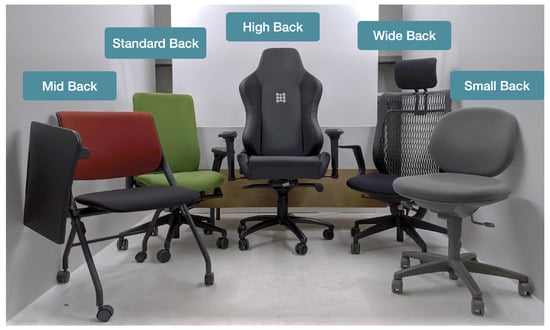 To investigate the portability of our machine-learning-based posture recognition system and its adaptability to different environments, we conducted a portability study where we tested the various machine learning models on five datasets obtained from five different chair types. The chair types investigated cover the most common variations in backed chairs and were: the Small Back chair type, where the back area covers a smaller area of the user’s back, namely the lumbar and center region with no coverage of the shoulder region; the Standard Back chair type, which is the average ergonomic chair with coverage along most of the shoulder region, central region, and lumbar region of the back; the Mid Back chair type, which covers the central region only with no coverage of the shoulder region and lumbar region; the High Back chair, which has additional coverage vertically in both the shoulder region and the lumbar region, but is curved inwards at the edges; the Wide Back chair, which has additional coverage horizontally in the shoulder region, the central region, and the lumbar region, but is slightly curved at the edges. The different chairs used are shown in Figure 6.