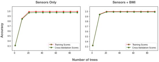 Random forest is a widely used and popular machine learning algorithm with extensive applications in both the scientific literature and in industry projects [51,52]. Figure 7 shows the validation curves for the random forest classifier when using sensor data only and when using sensor data with the BMI. The maximum accuracy was reached early at a depth of 30 trees, which is a reasonably low threshold for successful real-time use. This result is important because of its suitability for implementation and deployment in mobile and IoT environments.