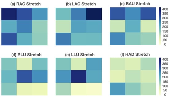 Average pressure distribution heat maps of the six common chair-bound stretches: (a) Right Arm Cross (RAC); (b) Left Arm Cross (LAC); (c) Both Arms Up (BAU); (d); Right Leg Up (RLU); (e) Left Leg Up (LLU); (f) Hanging Arms Down (HAD).