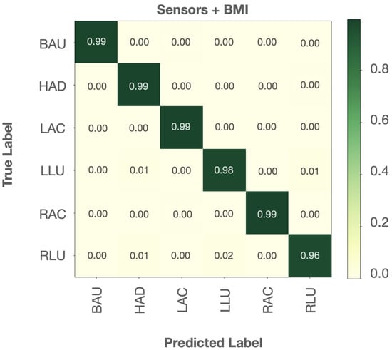 As in Bourhamoune and Amagasa (2019) [46], the Random forest classifier and the decision tree classifier achieved the best accuracies in both cases when using sensor data only and sensor data with the participant’s BMI. Random forest achieved the highest accuracy of 98.82% with the combination of sensor data and the BMI as the input and 97.09% with the sensor data only (Table 2). This difference in classification accuracy when using the BMI as an additional feature is significant (Wilcoxon signed rank test, ) and shows that the BMI can indeed be useful in capturing individual variability in posture adoption.
