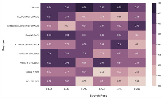 Figure 10 shows the cosine similarity matrix between the six seated stretches and nine common sitting postures that are representative of the aforementioned 15 posture labels with a focus on imbalances along the left and right axes and the forward and backward axes. A high cosine value indicates that a stretch pose’s pressure distribution is closely related to that of a sitting posture. By comparing the cosine similarity between each stretch and each posture for all possible pairs, it is possible to establish a ranking system that matches each sitting posture with its least-similar stretch pose. These results show that, indeed, our posture–stretch recommendation method was successful in capturing the correct stretch pose for each posture in alignment with physiotherapy standards. For instance, for the “Upright” posture, the least similar stretch pose is “Hanging Arms Down” (HAD); for the Slouching Forward posture, the least similar stretch pose is “Both Arms Up”, followed equally by both “Right Arm Cross” (RAC) and “Left Arm Cross” (LAC); for the posture “Extreme Slouching Forward”, which notably engages the lumbar region, the least similar stretch is “Left Leg Up” (LLU) and “Right Leg Up” (RLU); for the postures “Leaning Back” and “Extreme Leaning Back”, the least similar stretch pose is “Hanging Arms Down” (HAD); for the postures “No Right”, “No Left”, “No Right Shoulder”, and “No Left Shoulder”, their least similar stretches are those with their opposite position to the posture, respectively, i.e., for “No Right” and “No Right shoulder”, it is “Left Arm Cross” (LAC), and for “No Left” and “No Left Shoulder”, it is “Right Arm Cross”.