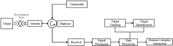 Radar systems generally consist of a signal transmitter, a signal receiver, signal processing components, data processing components, and other important parts. As shown in Figure 1, the signal transmitter and receiver are responsible for sending and receiving electromagnetic waves. Signal processing extracts target measurement data according to the characteristics of transmitted and received signals [26]. Data processing estimates the target state based on measurement data, and target tracking is the main method for target state estimation [27]. As the main function module of data processing, the target tracking module is responsible for estimating specific target information such as position, velocity, and acceleration according to the output data of signal processing, so as to realize the target detection function of radar.