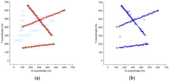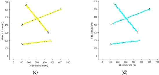 Position estimates of different filters (). (a) MFGM–PHD filter. (b) GM–PHD filter. (c) Joint–GLMB filter. (d) LGM–PHD filter.