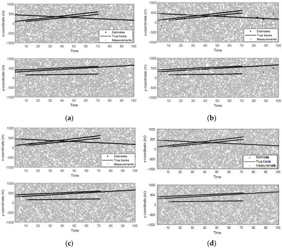 Figure 3 and Figure 4 show the trajectories of the targets as well as the tracking result of a single sample run of different filters. As can be seen from Figure 3 and Figure 4, when the detection probability is high and clutter density is low (), the four filters can track well.