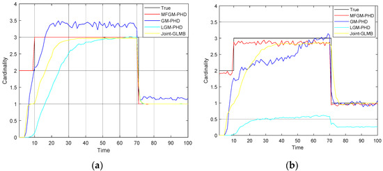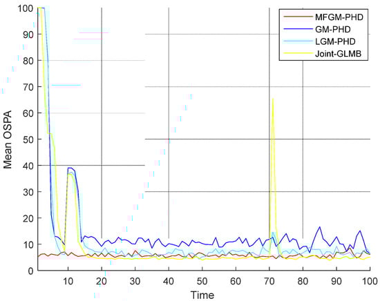 In Scenario 2, when the detection probability is , the performance of four filters is compared under various clutter rates. Figure 8 shows that as the clutter rate increases, the mean OSPA distances of the proposed MFGM-PHD filter and the joint-GLMB filter are almost unchanged, but the mean OSPA distances of the GM-PHD filter and the LGM-PHD filter obviously increase. With a clutter rate of , the mean OSPA distances of the proposed MFGM-PHD filter, the LGM-PHD filter, and the joint-GLMB filter are similar but they are all superior to that of GM-PHD filter. However, the mean OSPA distances of the proposed MFGM-PHD filter is superior to that of LGM-PHD filter and the joint-GLMB filter when the new target appears at = 10 s and targets die at = 70 s. When the clutter rate is , , and , the mean OSPA distance of the proposed MFGM-PHD filter is significantly better than that of the LGM-PHD filter and the GM-PHD filter. The mean OSPA distance of the proposed MFGM-PHD filter is similar to or slightly higher than that of the joint-GLMB filter. However, when the new target appears at = 10 s and targets die at = 70 s, the mean OSPA distance of the proposed MFGM-PHD filter is lower than that of the joint-GLMB filter. Figure 9 shows that the proposed MFGM-PHD filter is better than the other three filters in cardinality estimation when new targets appear at = 1 s and = 10 s. When the clutter rate increases, the cardinality estimation performance of the proposed MFGM-PHD filter basically remains unchanged, while the cardinality estimation performance of the other three filters all decreases, especially for the LGM-PHD filter.