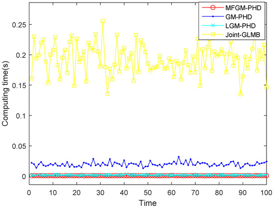 Figure 7 shows the computing time of different filters. It shows that the computing time of the proposed MFGM-PHD filter is slightly better than that of the LGM-PHD filter, but obviously better than that of GM-PHD filter and joint-GLMB filter.