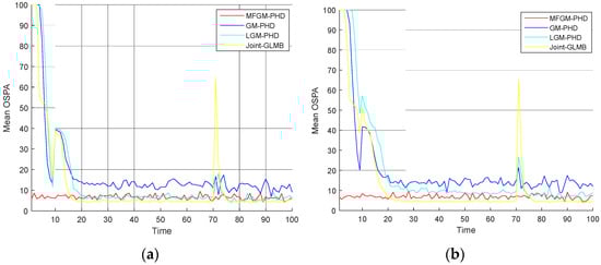 In this section, simulations are designed to demonstrate the efficiencies of the proposed MFGM-PHD filter. The results are compared with those of the standard GM-PHD filter [16], the joint-GLMB filter proposed by [19], and the LGM-PHD filter proposed by [20]. The simulations are performed as follows.