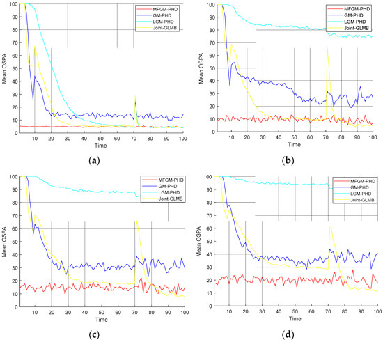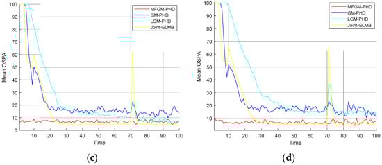 Mean OSPA distances of different filters under various probabilities of detection (). (a) . (b) . (c) . (d) .