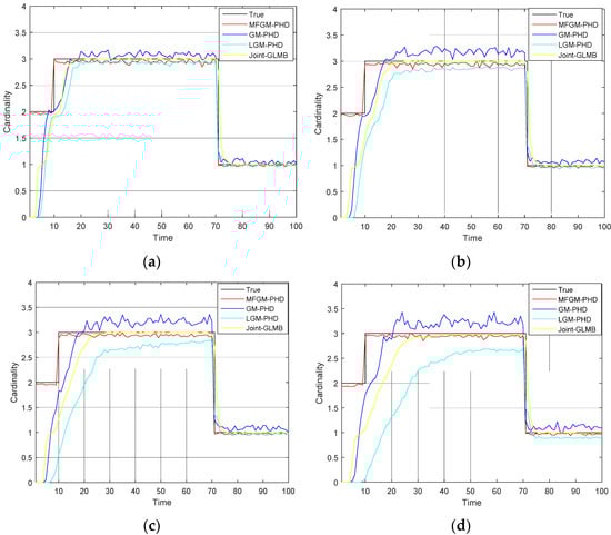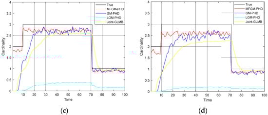 Mean cardinality of different filters under various probabilities of detection (). (a) . (b) . (c) . (d) .