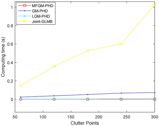 Figure 10 shows the computing times of different filters under various clutter rates. It shows that as the clutter rate increases, the computing time of the joint-GLMB filter increases obviously, the average computing times of the proposed MFGM-PHD filter and LGM-PHD filter are basically unchanged. However, the tracking accuracy performance of the proposed MFGM-PHD filter is superior to the LGM-PHD filter. Compared to the other three filters, the proposed MFGM-PHD filter still has excellent real-time performance in a dense clutter.