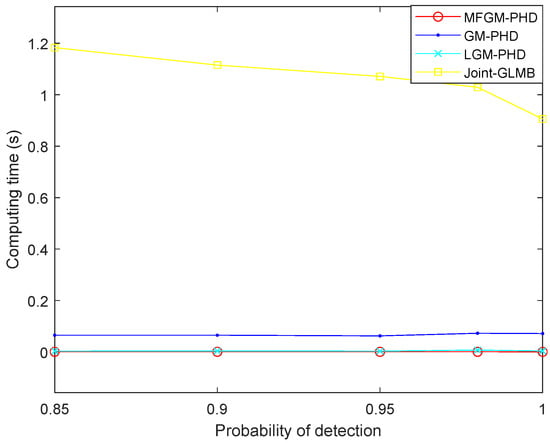 Figure 13 shows that as the detection probability decreases, the computing time of the joint-GLMB filter increases, the average computing times of the proposed MFGM-PHD filter and LGM-PHD filter are basically unchanged, but the tracking accuracy performance of the proposed MFGM-PHD filter is superior to the LGM-PHD filter.