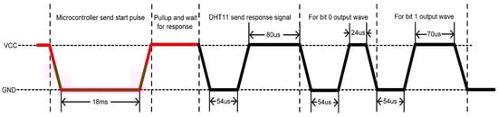 The communication process with the microcontroller is divided into three steps. The first is to send a request to the DHT11 sensor. The sensor sends a response pulse back, and then it sends data totalling 40 bits to the microcontroller, as shown in Figure 3. After delivering 40 bits of data, the DHT11 sensor has a 54 µs low level and then goes high. It goes into sleep mode after this.