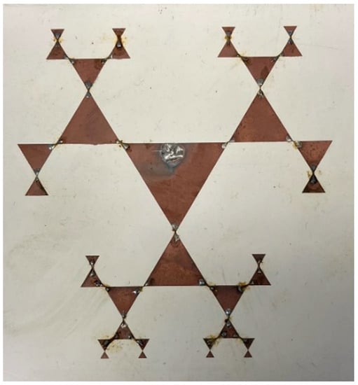 Multiple designs of patch and fractal antennas for energy harvesting, their matching circuits with a rectifier, and rectifier schemes have been schematically modelled and experimentally investigated. The antennas were formed on various polymer substrates with different dielectric constants using SSAIL technology to form electrical conductivity tracks. The antenna shape is based on fractals taken from the website [20]. It is similar to the well-known Sierpiński gasket. It is shown that such a type of antenna made on a 1.6 mm FR4 substrate has five different resonant frequencies [21]. Figure 4 shows the designed and manufactured fractal antenna.